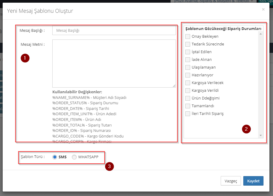 Sipsis hazır mesajlar için gelişmiş bir şablon motoru ile beraber gelir. Farklı sipariş durumlarına farklı mesaj şablonları oluşturabilir, her durum için benzersiz mesajlar gönderebilirsiniz.