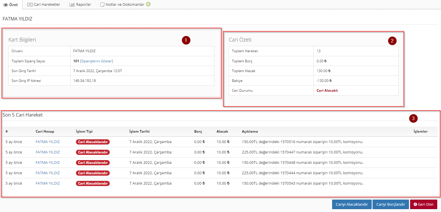 İlgili bayinizin bayi kartı açılacaktır, buradaki alanlar aşağıda numaralandırılarak anlatılmıştır.