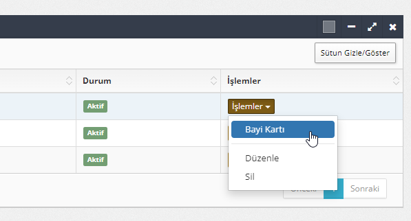 Karşınıza CRM uygulamanızda ekli olan bayilerin listelendiği bir ekran gelecektir. İlgili bayi kullanıcısnın en sağında ye alan "İşlemler > Bayi Kartı" butonuna tıklanır.