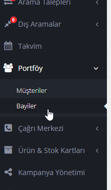 Sipsis CRM Uygulamanıza yeni bayi kullanıcısı oluÅŸturmak için sol menüden "Porföy > Bayiler" butonuna tıklanır.