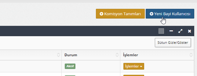 Karşınıza crm uygulamanıza daha önce eklemiÅŸ olduÄŸunuz bayi kullanıcılarının bir listesi gelecektir. SaÄŸ üst köÅŸede bulunan "Yeni Bayi Kullanıcısı" butonuna tıklayın.