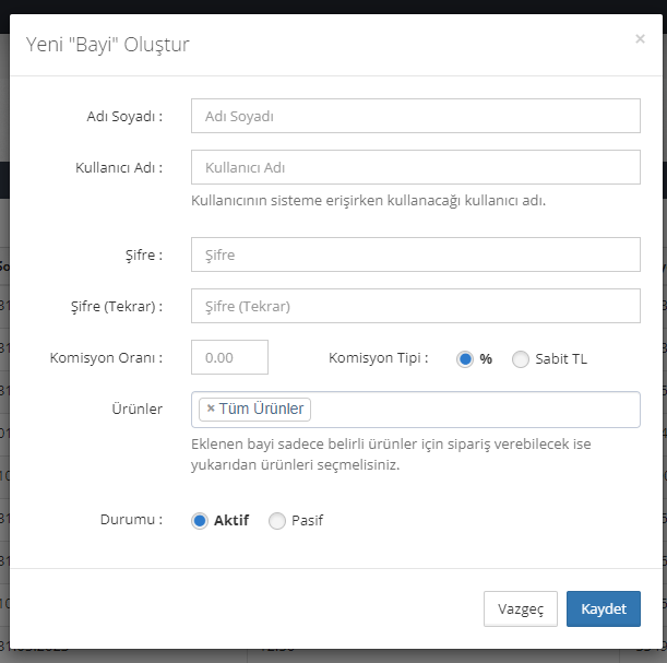 Sizden yeni Bayi Kullanıcısına ait bilgileri isteyen bir kayıt formu karşınıza gelcektir. Burada istenen alanların açıklamaları aÅŸağıda ayrıca belirtilmiÅŸtir.