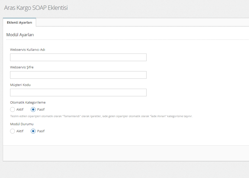 3-> Sizden ARAS kargo entegrasyonu için gerekli alanların doldurulmasını isteyen bir form açılacaktır. Formda yer alan parametrelerin detayları aÅŸağıda ayrıca açıklanmıştır.