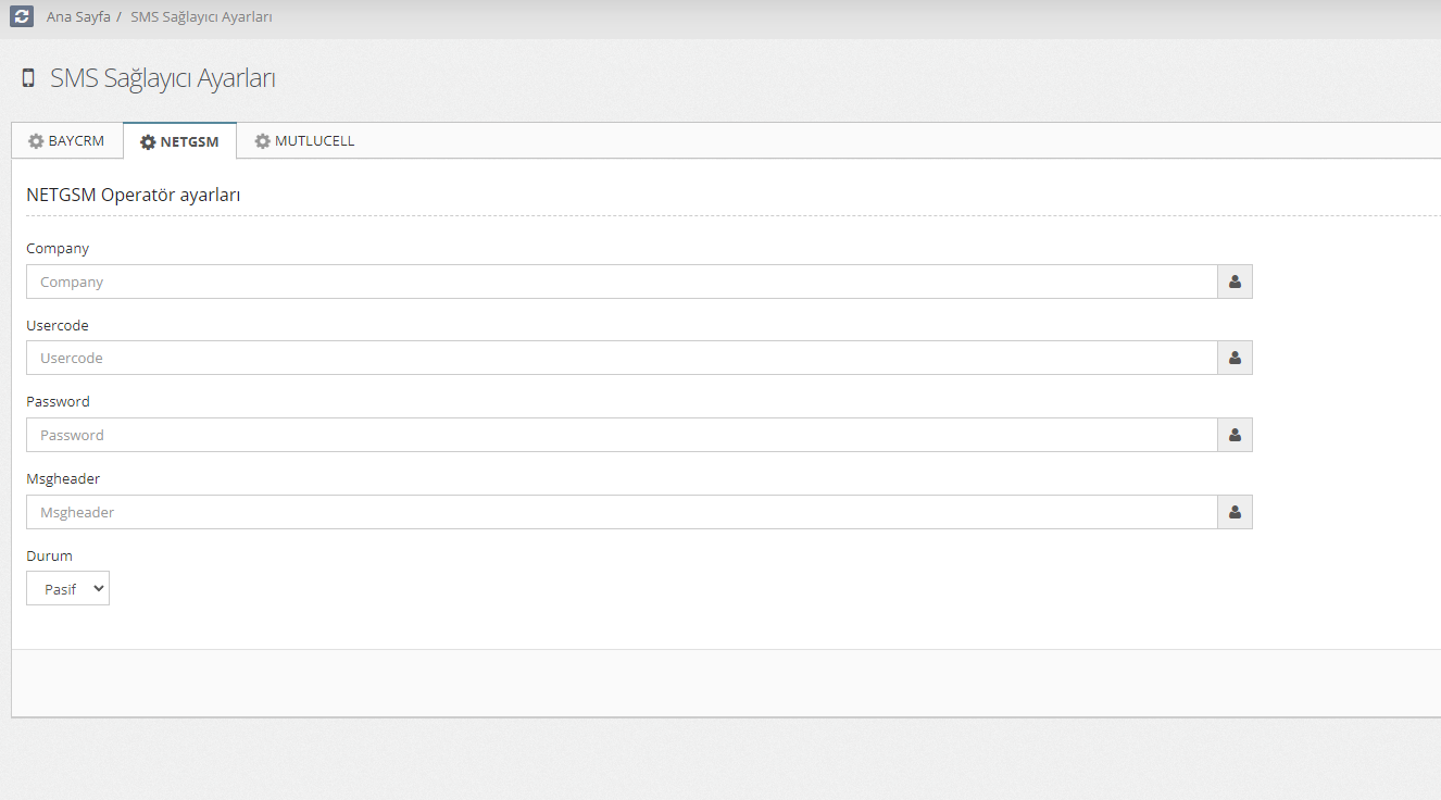 2-> Açılan sayfadan "NETGSM" sekmesine tıklayın ve sizden istenen parametreleri doldurun. Parametrelerin açıklamaları ayrıca anlatılmıştır.