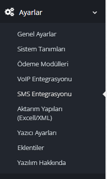 1-> Netgsm SMS entegrasyonu için, uygulamanızın sol menüsünde yer alan "Ayarlar" -> "SMS Entegrasyonları" butonuna tıklayın.