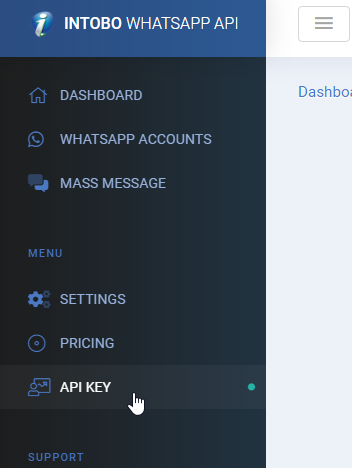 1-> www.intobo.com üzerinden hesabınıza giriş yapın ve sol menüde yer alan API KEY butonuna tıklayın.
