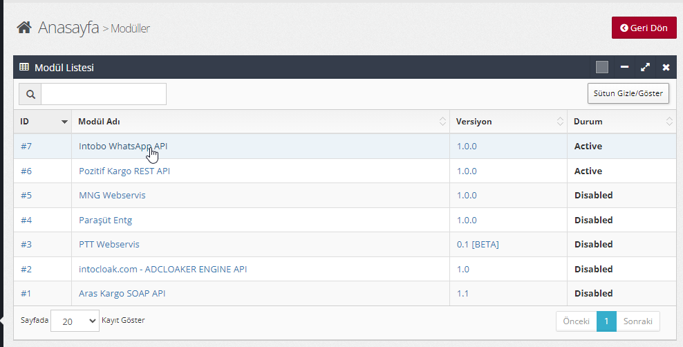 3-> Karşınıza uygulamanızda bulunan eklentilerin yer aldığı bir liste gelecektir. Listeden "Intobo WhatsApp API" linkine tıklayın.