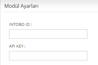 4-> Gelen ekrana 2.adımda intobo.com üzerinden temin ettiğiniz "INTOBO ID" ve "API KEY" parametrelerini ilgili alana girin.