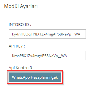5-> Gerekli alanları doldurduktan sonra "Whatsapp Hesaplarını Çek" butonuna basılarak intobo.com'a eklediğiniz whatsapp hesaplarınızı senkronize edin.