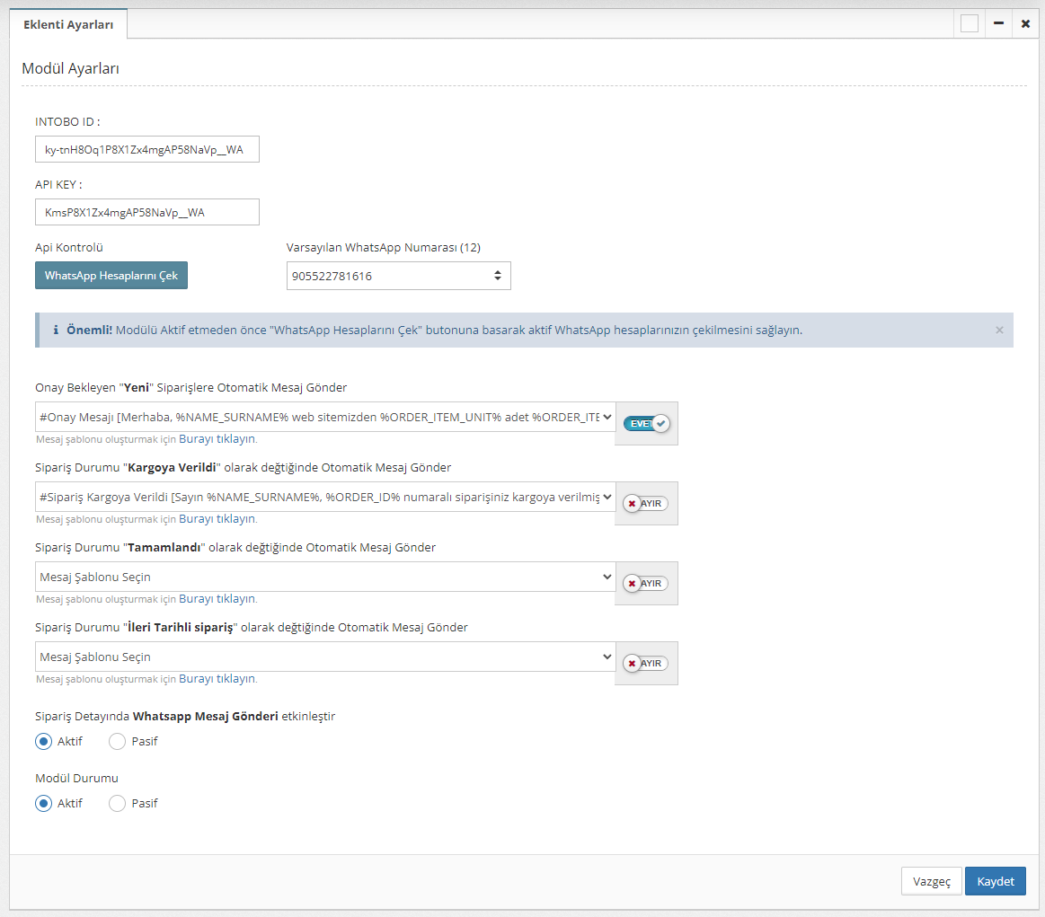 7-> Son olarak uygulamanızın her yeni siparişte otomatik mesaj gönderip göndermeyeceğini, gönderilecek mesaj şablonlarını tercihleriniz doğrultusunda düzenleyip modülü aktif edin.