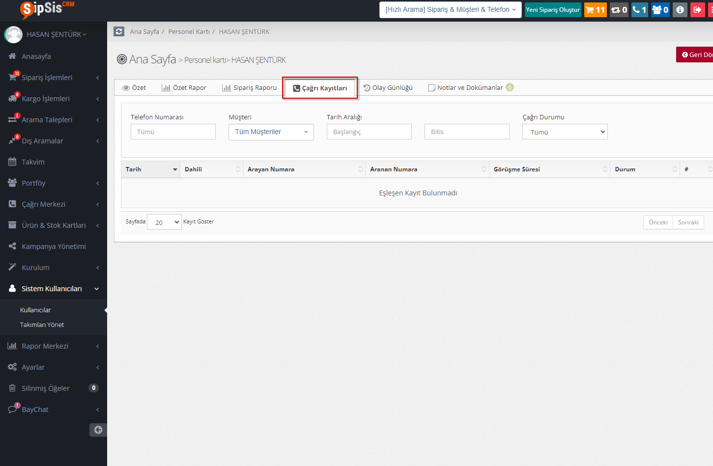 Personel kartı özet ekranı açılacaktır. Üst sekmede bulunan "Çağrı Kayıtları" sekmesine tıklanarak personele ait çağrıları görebilir, filtre araçları ile görüşme kayıtları arasında aramalar yapabilirsiniz.