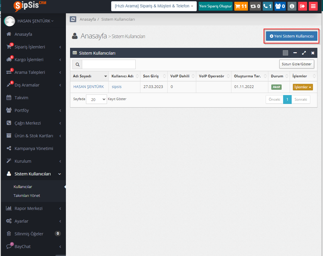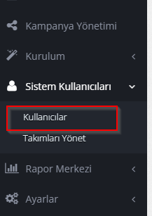 Sipsis CRM uygulamanıza yeni bir kullanıcı eklemek için uygylamanızın sol menüsünde yer alan Sistem Kullanıcıları > Kullanıcılar butonuna tıklayın.
