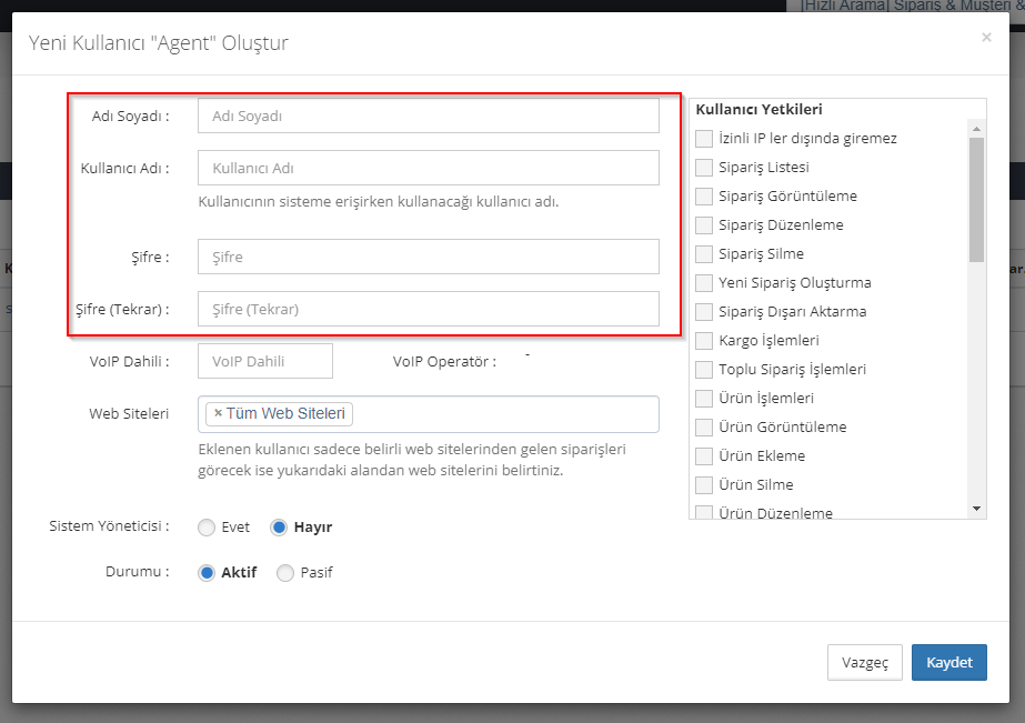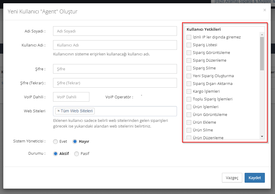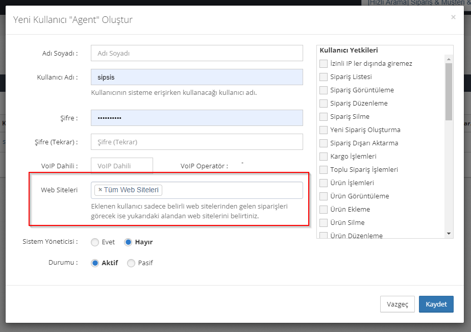 Ekleyeceğiniz kullanıcının hangi web sitesinden gelen siparişler üzerinde işlem yapacağını sınırlandırabilirsiniz. Eğer böyle bir sınırlama kullanacaksanız açılan listeden web sitelerini seçebilirsiniz.