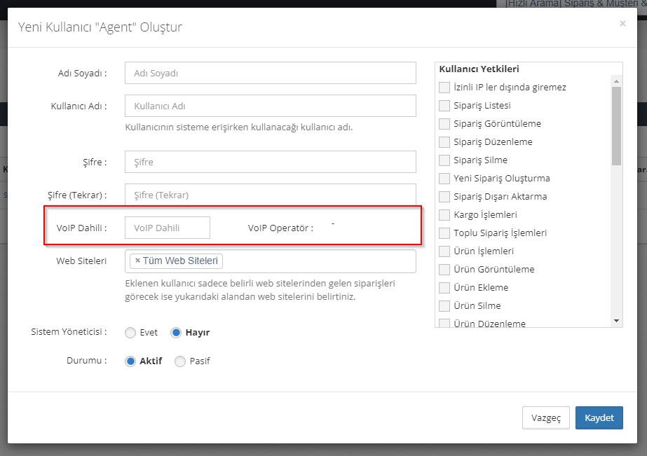 Eğer CRM uygulamanızda bir Voip entegrasyonu var ise kullanıcıya ait Dahili numarası ve Voip Operatörü seçin