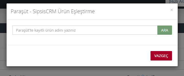4-> Açılan ekranındaki arama erkdanına ilgili ürünün Paraşüt Uygulamanızdaki ürün adı girilerek arama yapılır ve sonuçlardan seç butonuna basılarak eşleştirme tamamlanır.