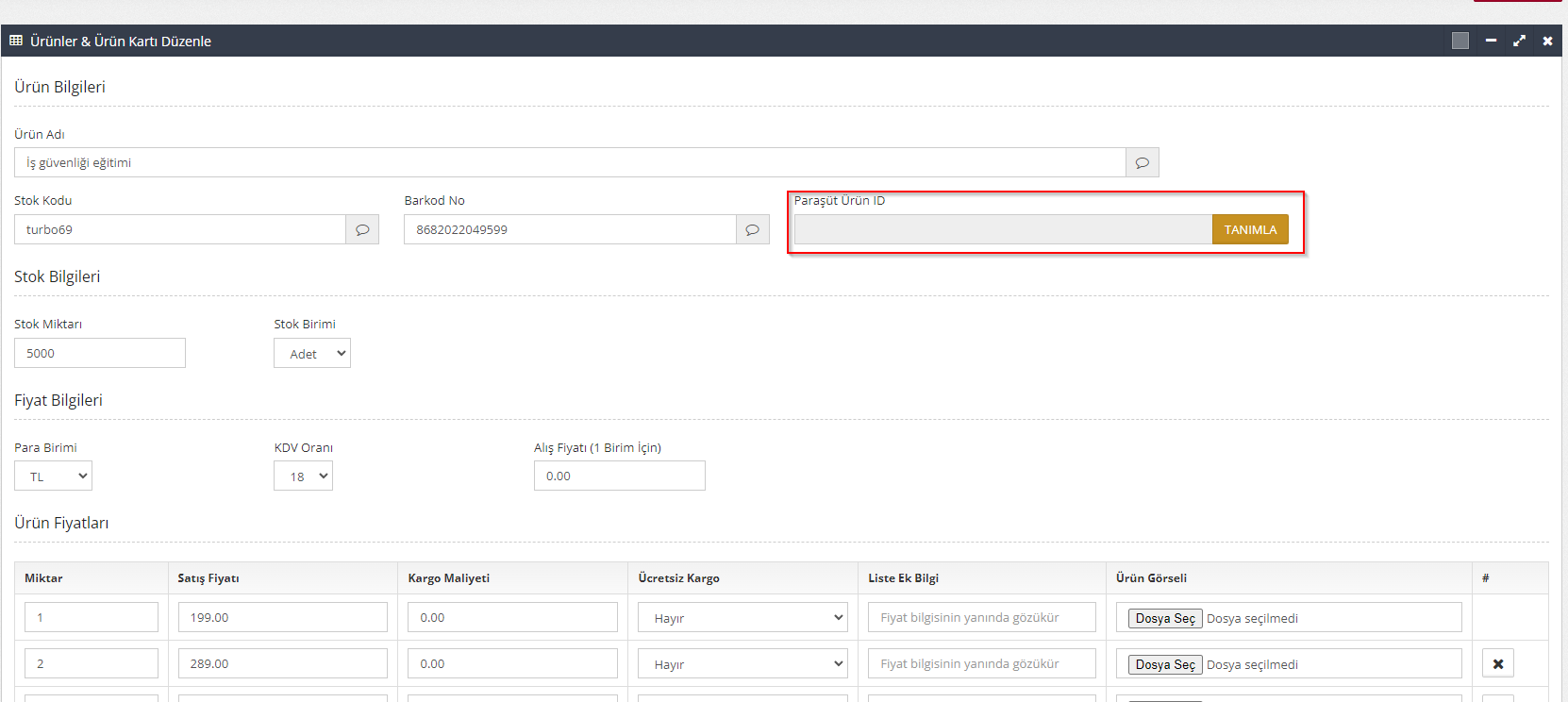 3-> Ürün kartı ekranında Paraşüt Ürün ID değeri boş ise henüz bu ürün ile bir eşleştirme yapılmamıştır. İlgili alanın sağında yer alan "TANIMLA" butonuna basarak ürün arama ekranına ulaşılır.