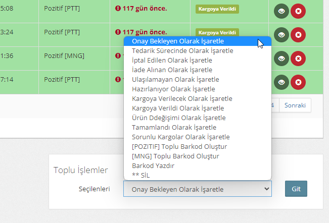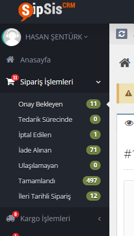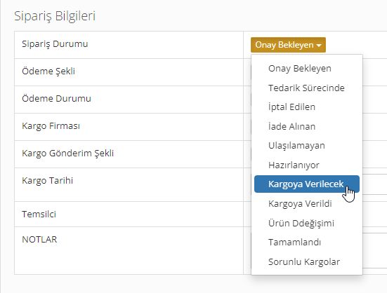 Sisteme kayıt edilen her sipariş personeliniz tarafından veya entegrasyon sırasında farklı bir parametre ayarlamadıysanız varsayılan olarak "Onay Bekleyen" durumunda sisteminize kayıt edilir. Çağrı merkezi veya satış temsilcileriniz ilgili siparişin tedariğini, adres, telefon gibi bilgilerin doğruluğunu onayladıktan sonra ilgili siparişin hangi kargo firması ile gönderileceğini seçerek kargo süreçlerinin devam etmesi için ilgili duruma yönlendirir.