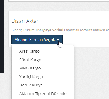 Uygulamanız içerisinde kayıt edilen tüm siparişleri excel formatında dışarı aktarabilirsiniz. Sistem içerisinde kargo firmalarının talep ettiği excel formatında hazır excel şablonları yer almaktadır. Dilerseniz excel olarak dışarı çıkarmak istediğiniz verileri kendi oluşturduğunuz özel excel şablonları ile de dışarı aktarabilirsiniz. Özel Excel şabllonları oluşturma makalemize göz atabilirsiniz.