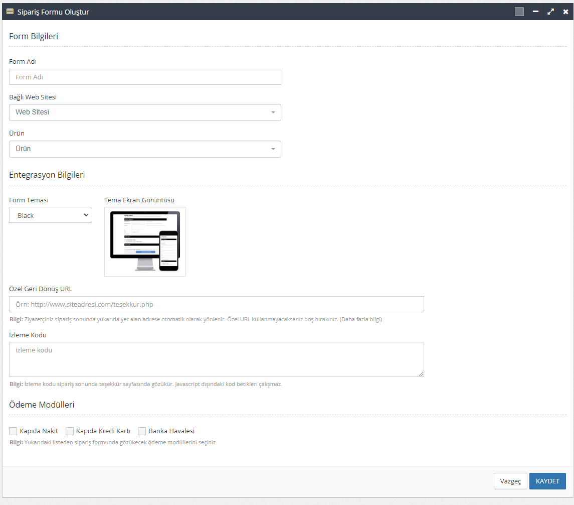 - Ödeme Modülleri : Sipariş formunuzda müşterinize sunmak istediğiniz ödeme seçeneklerini seçmenzi gerekmektedir.