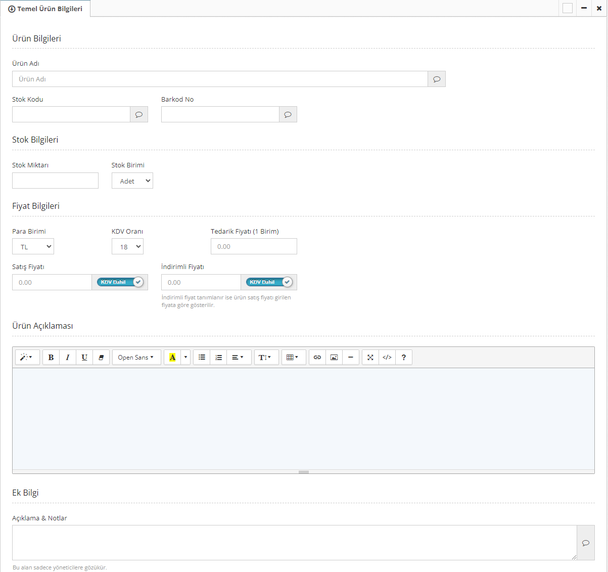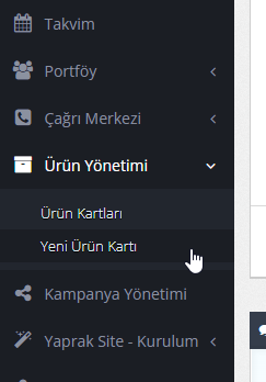 1-> CRM uygulamanızda sol menüde bulunan "Ürün Yönetimi" -> "Yeni Ürün Kartı" butonuna tıklayın.