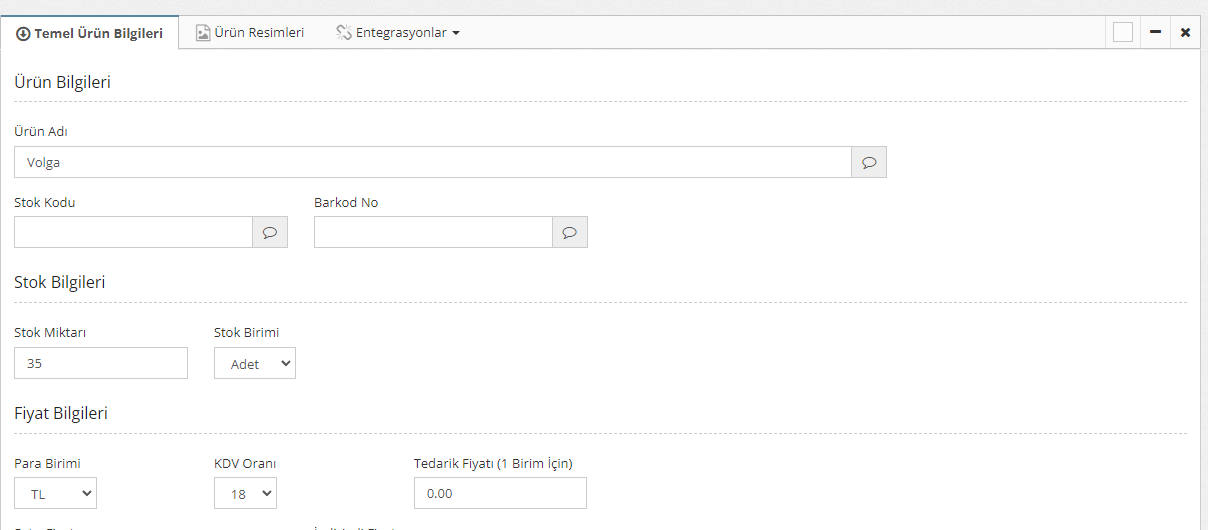 3-> Ürün oluşturma işlemi tamamlandıktan sonra, ürününüze ait görseller ve Enterasyonlar için farklı parametreler ayarlayabileceğiniz sekmeler aktif hale gelecektir.