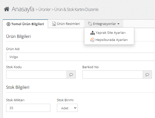 4-> Bu senaryomuzda yaprak site modülü için adet bazlı farklı fiyatlandırma ve ürün varyantları örneklendireceğiz. Üst sekmede yer alan "Entegrasyonlar -> Yaprak Site Ayarları" butonuna tıklayın.