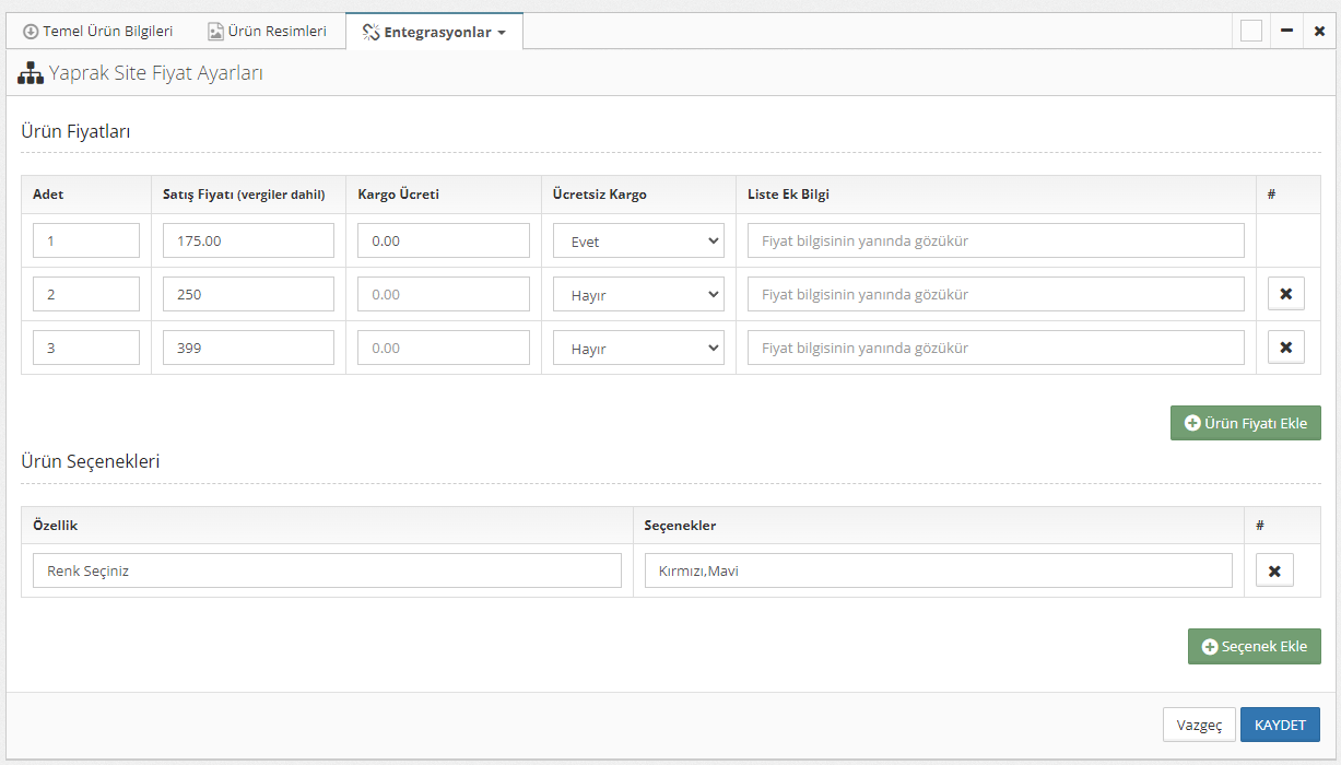 5-> Bir ürüne adet bazlı farklı fiyatlandırma ve ürün varyantlarını tanımlayabileceğiniz form ekranı açılacaktır :