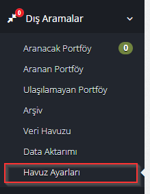1-> CRM uygulamanızın sol menüsünde yer alan "Dış Aramalar" -> "Havuz Ayarları" butonuna tıklanır.
