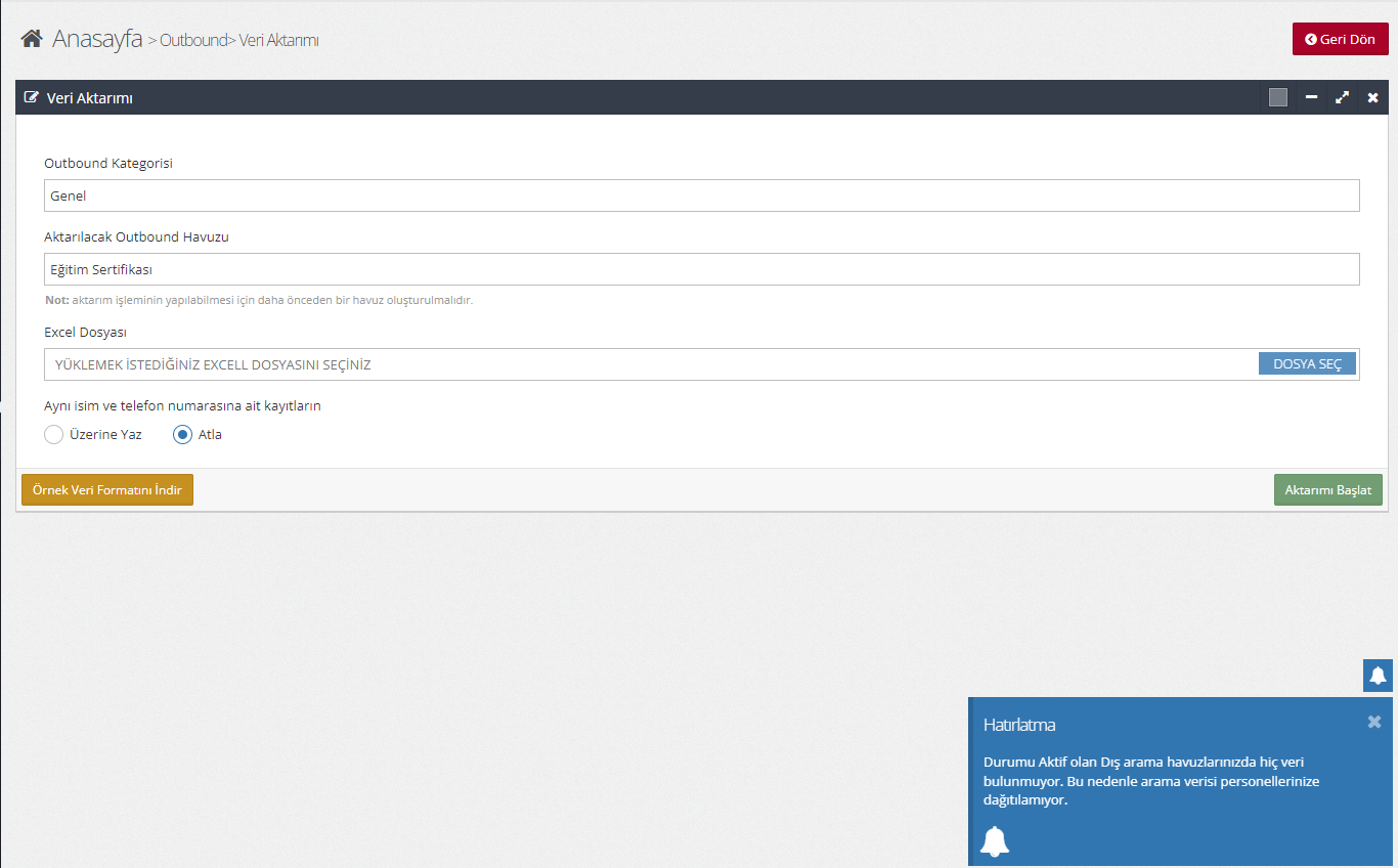 Oluşturulan arama havuzlarına toplu veri aktarımları yapabilir ve bu verileri personellerinize dağıtabilirsiniz. Bu makalemizde bir arama havuzu oluşturup havuza dahil personeller belirterek havuzumuza toplu telefon numarası aktarımı yapacağız.