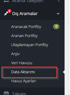 5-> Uygulamanızda sol menüde yer alan "Dış Aramalar" -> "Data Aktarımı" butonuna basın.