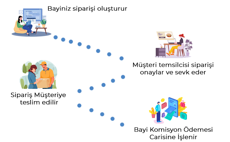 Sisteminize bayi kullanıcıları oluşturarak bayilerinize özel bir ekran tanımlayabilir, oluşturduğunuz bayilere komisyon oranları belirterek bayilerinizin sisteme girdiği her siparişin otomatik olarak hakedişlerini hesaplatabilir, bayi cari hesaplarınızı rahatlıkla yönetebilirsiniz